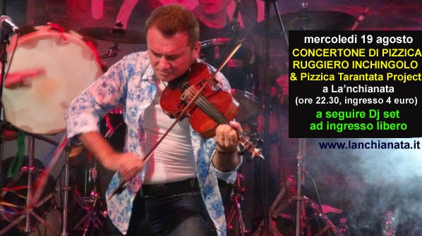 “Quando gli acuti del violino incontrano il ritmo ossessivo del tamburello, la performance diventa energia allo stato puro”. Denominato “il violinista della pizzica”, Ruggiero Inchingolo è il diretto discendente di Luigi Stìfani, lo storico violinista terapeuta dei rituali del “morso” della taranta. Prestigioso musicista polistrumentista, oltre che violinista, Ruggiero sul solco della tradizionale pizzica tarantata del suo maestro, Luigi Stifani, esegue e reinterpreta con i suoi strumenti le pizziche suonate durante le cure domiciliari dei rituali di tarantismo: l’indiavolata, la sorda, la minore, la balcanica. Ai brani tradizionali alterna anche pezzi di nuova composizione, che si rifanno sia alla musica tradizionale popolare italiana (tarantelle e serenate) che ad altre civiltà musicali, dal mondo arabo fino ai paesi dell’ Europa. In questo spettacolo è proprio il ritmo travolgente del tamburello di Carlo “Canaglia” De Pascali, primo tamburellista dell’orchestra della Notte della Taranta, ad eccitare il violino di Ruggiero, le cui note più alte vanno dritto al cuore. Durante i concerti la folla si scatena e si esalta lasciandosi trascinare dal magico ritmo e dal suono ipnotico dei suoi strumenti. Formazione: Ruggiero Inchingolo (violino, mandolino, fisarmonica, oud, voce), Carlo De Pascali: (tamburello, tammorra, voce), Giuseppe Volpe (fisarmonica), Alessandro Buongiorno (chitarra), Martina Zecca (voce e tamburello), Antonio Biancolillo (batteria).